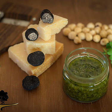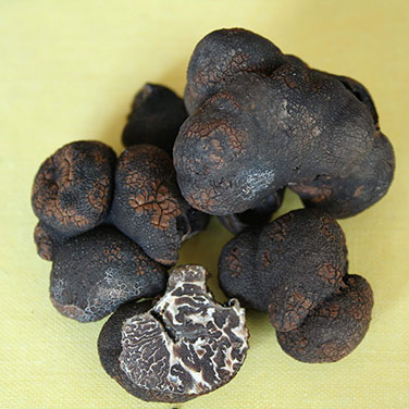 Fekete szarvasgomba, mérete a cseresznyétől az almáig változik. A külseje (szaknyelven peridiuma) fekete, változó méretű rücskökkel borított, belseje (szaknyelven gléba) éretten barna, erezett. Illata leginkább a főtt tejeskukoricára emlékeztet. Júniustól előfordulhat, de illatos példányokra inkább július-augusztustól számíthatunk egészen az első fagyokig. Ültetvényünkön kocsányos tölgy, kislevelű hárs és közönséges mogyoró gazdanövényen található.